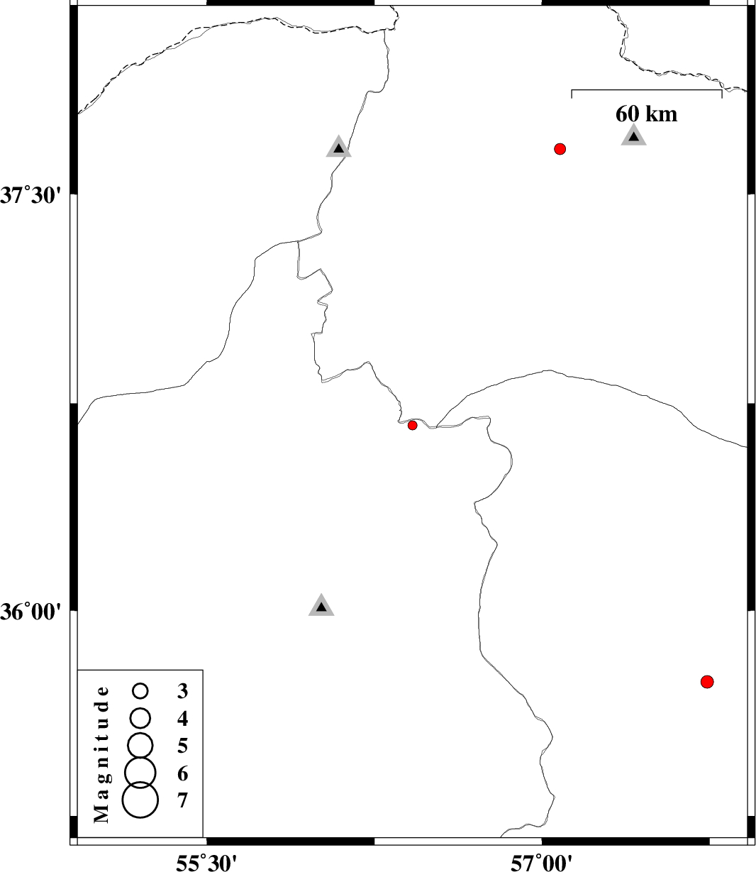 | 2015/06/09 | 01:27:58.3 | 05:57:58.3 | 37.66 | 57.08 | 14 | ML2.3 | Khorasan(north) Province, 17 km North-East of Ashkhaneh |