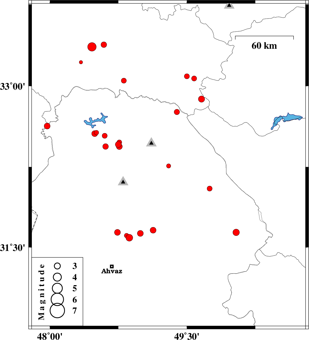 | 2015/06/06 | 13:16:20.8 | 17:46:20.8 | 32.63 | 47.97 | 14 | ML2.9 | Khoozestan Province, 40 km North-West of Andimeshk | ||