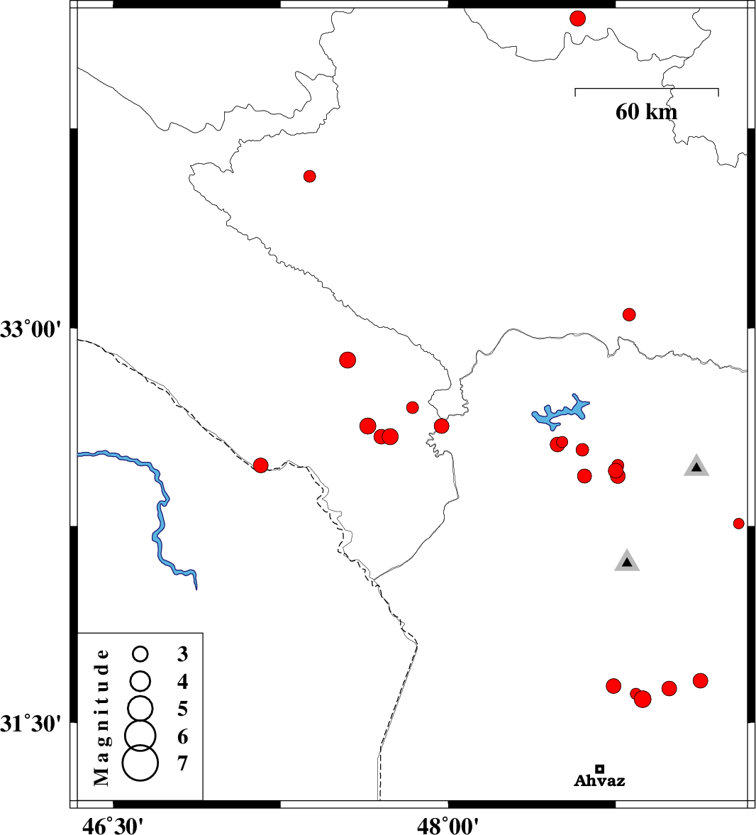 | 2015/06/06 | 13:16:20.8 | 17:46:20.8 | 32.63 | 47.97 | 14 | ML2.9 | Khoozestan Province, 40 km North-West of Andimeshk | ||