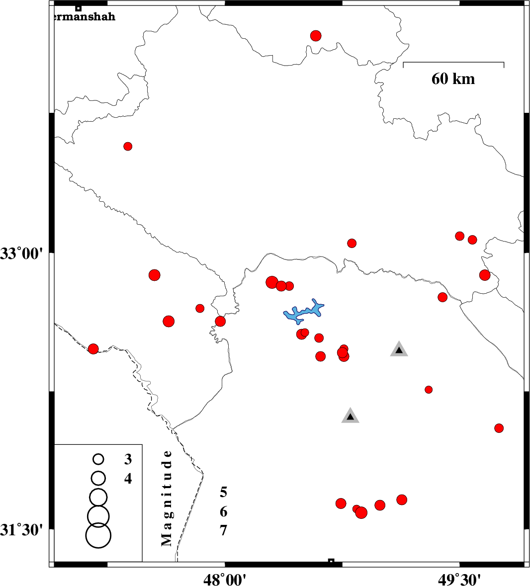 | 2015/06/06 | 13:16:20.8 | 17:46:20.8 | 32.63 | 47.97 | 14 | ML2.9 | Khoozestan Province, 40 km North-West of Andimeshk | ||