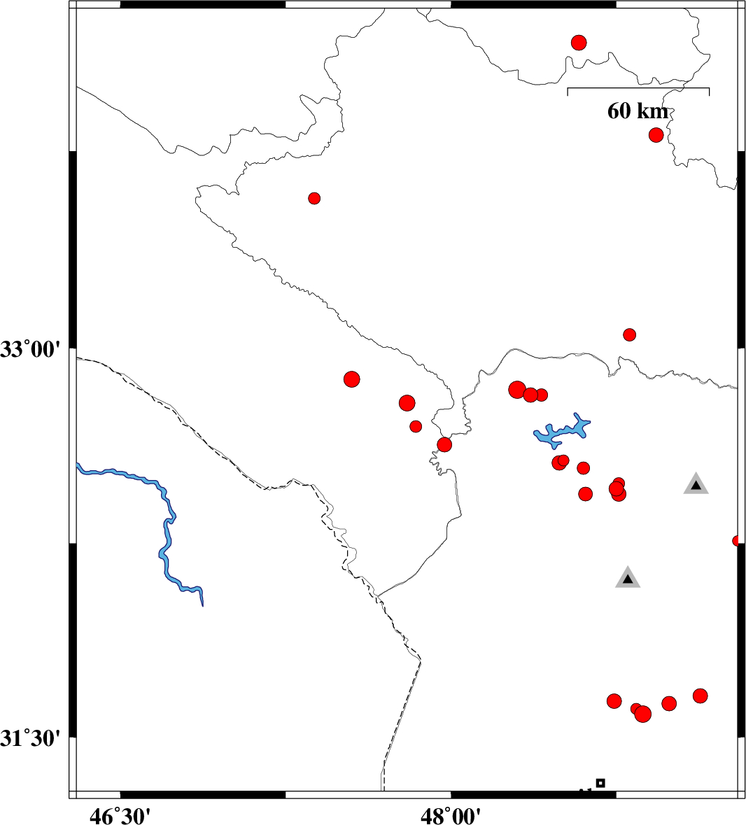 | 2015/06/27 | 22:20:09.4 | 02:50:09.4 | 33.81 | 48.93 | 6 | ML2.9 | Lorestan Province, 18 km East of Borujerd | ||