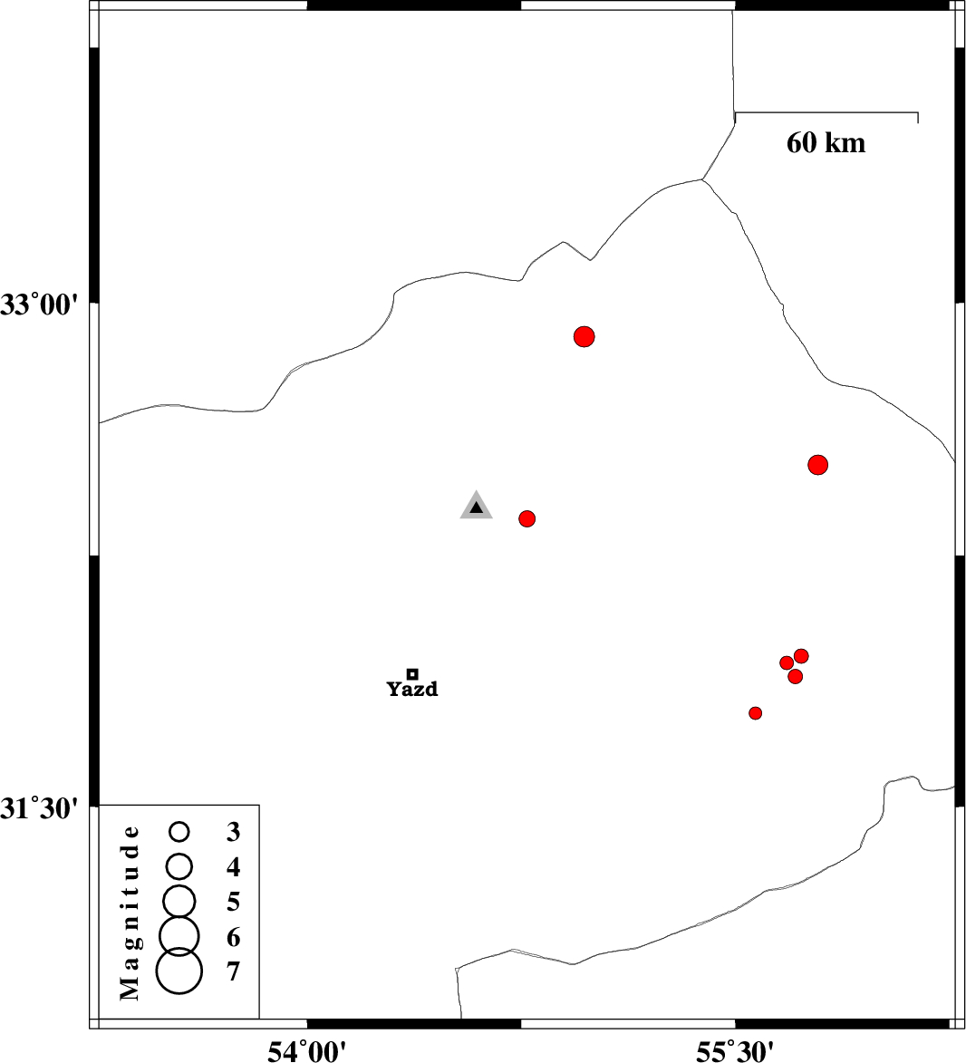 | 2015/06/29 | 14:55:09.8 | 19:25:09.8 | 32.36 | 54.77 | 6 | ML2.5 | Yazd Province, 70 km East of Ardakan | ||
